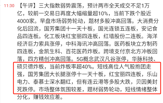 哪怕是早盘延续活跃的大消费板块一并出现兑现,低位个股相继炸板。与此同时高位情绪同样出现松动,高度板国芳集团炸板后翻绿大幅回落,人气股连云港等多股走弱,叠加市场大幅缩量,盘面一蹶不振。