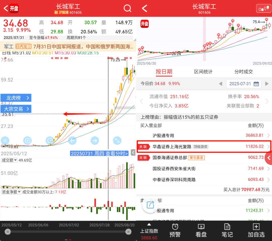 再看长城军工的大二波突破案例:受陆军首次披露无人化作战模式的消息刺激,8月4日,该股反包涨停彻底突破左侧平台压力位,开启大二波走势,华鑫光复路作为买二买入1.2亿,同样是平台突破与市场共振。后续长城军工一路高涨,他也在情绪高潮时择机退出,收获颇丰。