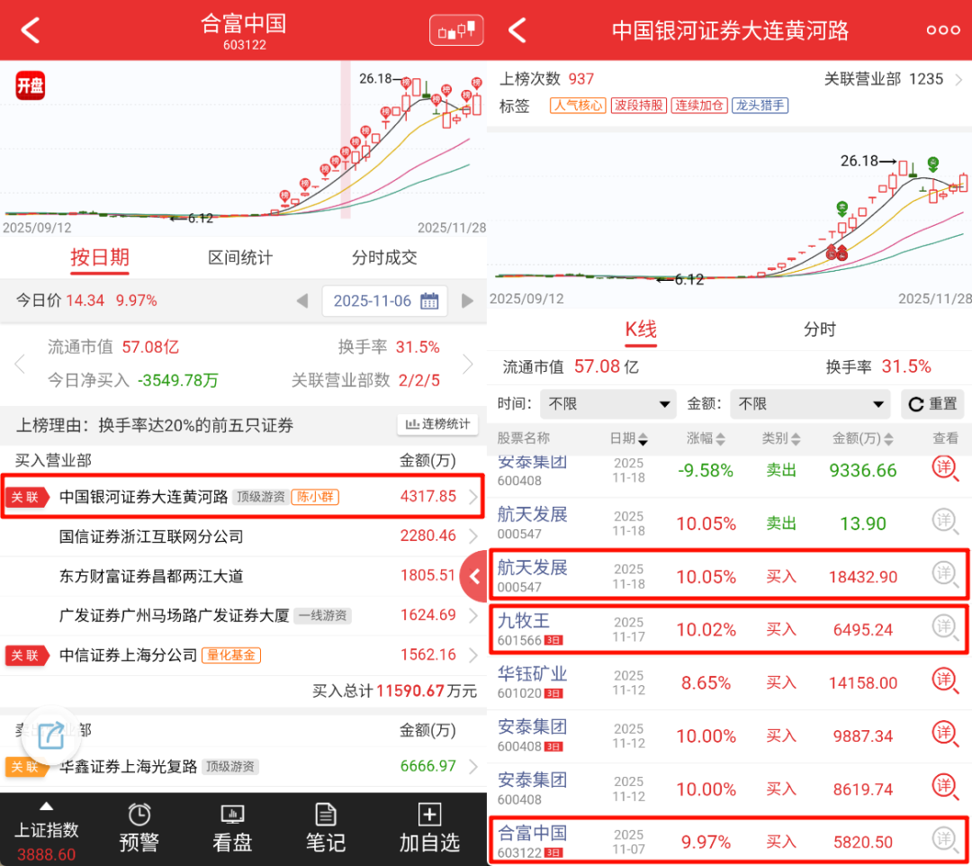 以合富中国八连板当日11月6日的龙虎榜数据为例,小群老师作为买一买入4317万元后,次日走弱并未急于兑现,等到后续合富中国继续走强后,小群老师接连介入安泰集团、九牧王、航天发展等短线股,在指数横盘震荡期的背景下,成功引领了一波短线情绪股的赚钱效应。他对合富中国的锁仓操作,给市场传递了明确的信心,进而吸引资金挖掘类似属性、形态的个股。这种对市场情绪的带动能力,是“龙头猎手”的重要特征。