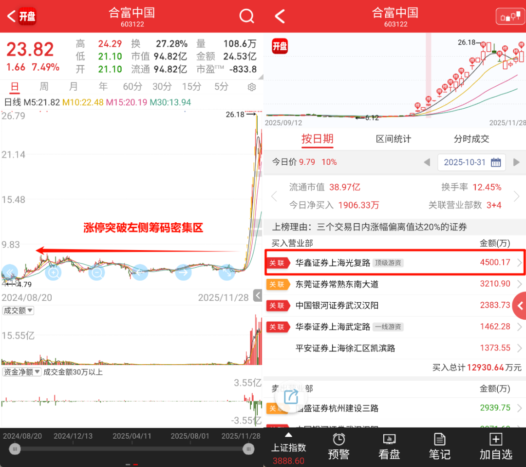 观察合富中国10月31日的龙虎榜数据,我们看到华鑫光复路作为买一买入4500万元。当天该股放量涨停,实现了对左侧筹码密集区的关键突破,并成为短线连板高度板。后续随着情绪的连续走强,该股一路主升浪,吸引了市场上众多的短线接力资金参与其中。这一操作正是华鑫光复路平台突破与市场共振的典型案例。