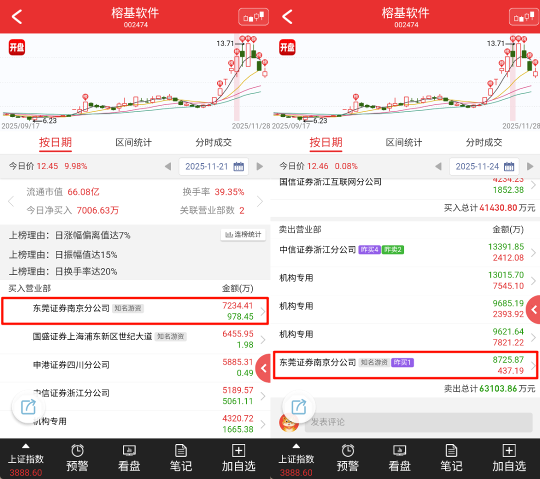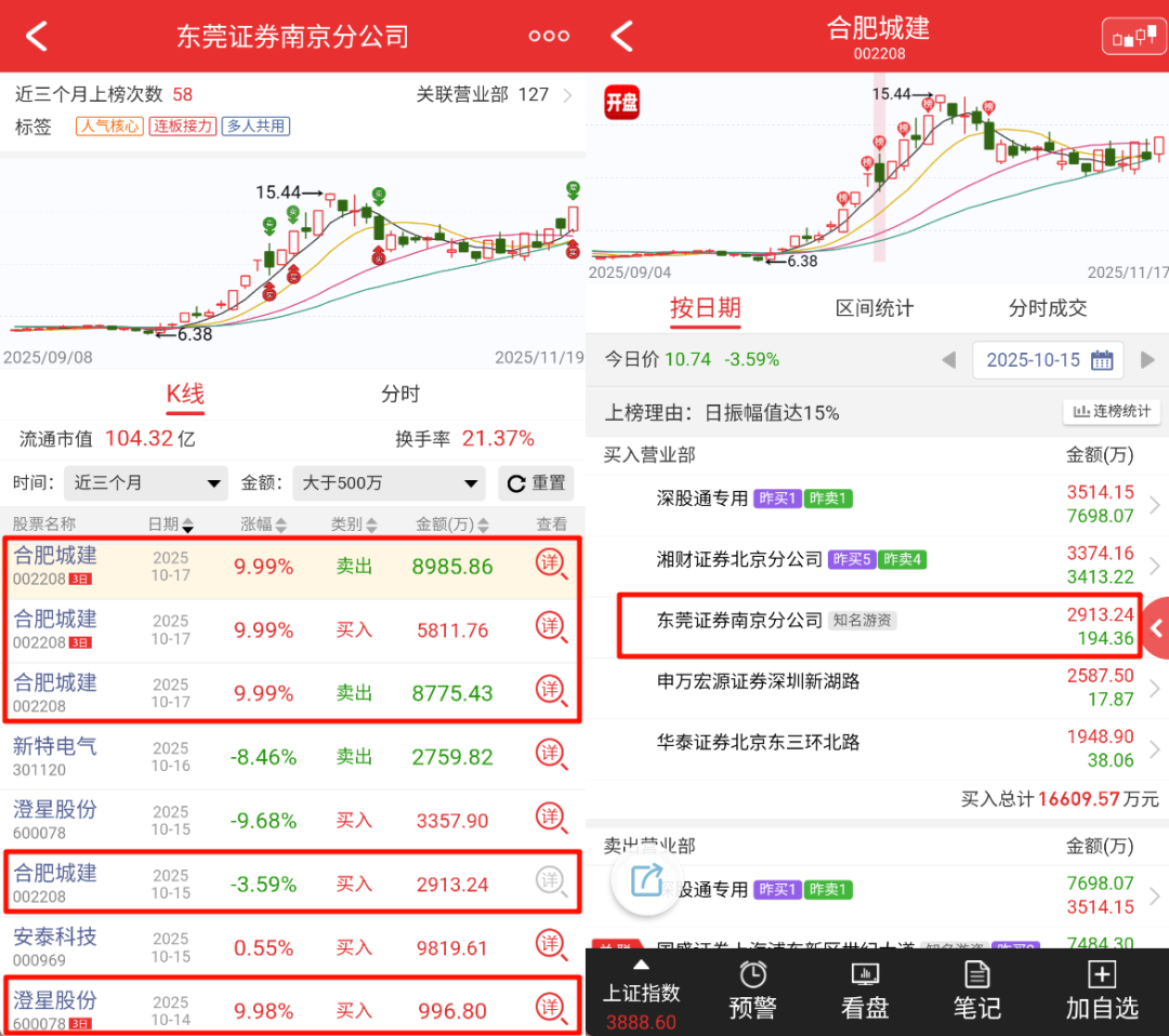 以11月21日榕基软件龙虎榜为例,东莞南京分作为买一买入7234万,隔日冲高卖出8726万获利20%,显然是前一天水下就开始主动引导。再看10月14日,东莞南京分在同一天内布局澄星股份(当天最高板四板)与合肥城建(当天次高板三板),体现出其对短线连板风格切换的敏锐嗅觉。澄星股份10月14日作为买四买入998万元,随后在10月15日开盘秒板继续加仓,可惜午后走弱,全天买入多达3357万;合肥城建10月15日买入2913万元,后续在该股中一路加仓并做T,最终于10月28日清仓退出。