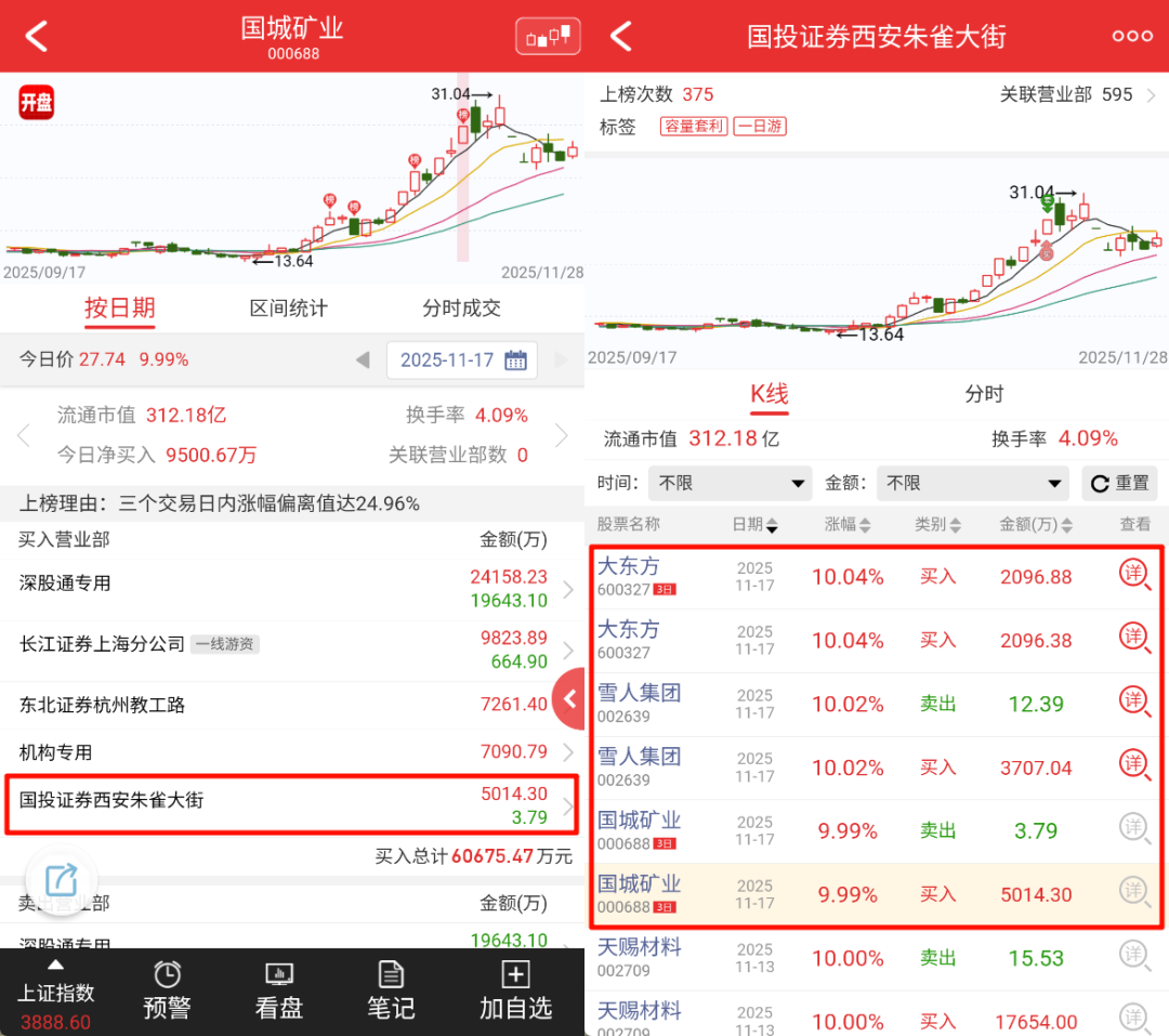 国投证券西安朱雀大街席位是“容量套利”风格的典型代表,其操作核心在于以全打板的方式介入流动性充裕的大市值个股,坚持“一日游”操作,依靠盘面走势快速套利,也是最经典的游资打法之一,这一招也是量化学的最快的,11月17日情绪加速日朱雀大街的操作就是其典型案例。